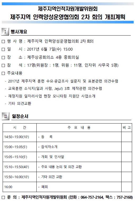 º» À§¿øÈ¸¿¡¼´Â Á¦ÁÖ Áö¿ª·»ê¾÷ ¸ÂÃãÇü Àη¾缺»ç¾÷ÀÇ ¿øÈ°ÇÑ ÃßÁø°ú Áö¿ª ³» È¿À²ÀûÀÎ Àη¾缺ü°è¸¦ ±¸ÃàÇϰíÀÚ ±¸¼ºµÈ 2017³â Á¦ÁÖÁö¿ª Àη¾缺¿î¿µÇùÀÇȸ 2Â÷ ȸÀǸ¦ ´ÙÀ½°ú °°ÀÌ °³ÃÖÇϰíÀÚ ÇÕ´Ï´Ù.